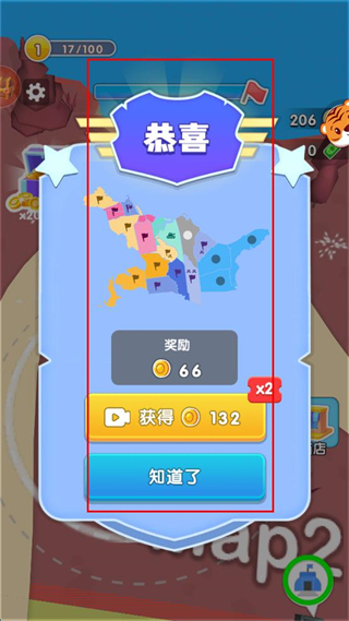 4、完成关卡后查看恭喜弹窗里的奖励,点击知道了按钮关闭弹窗继续游戏。