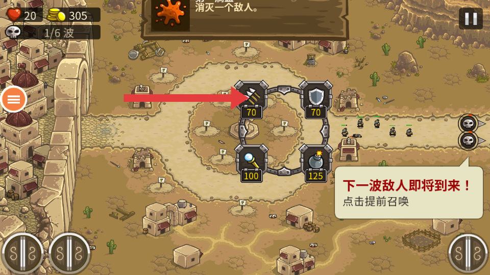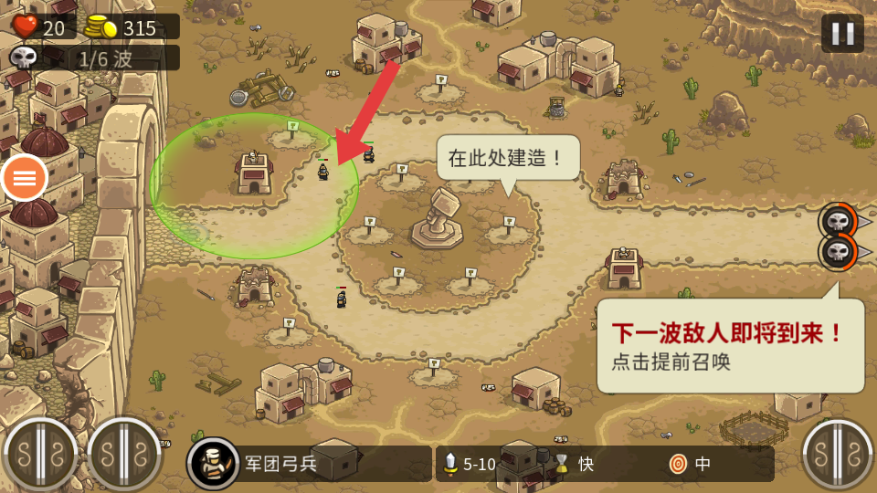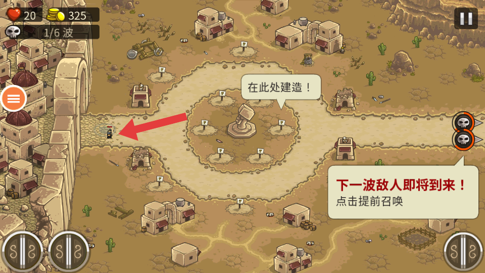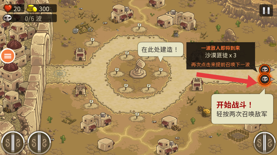 1、战斗开始前,点击右侧骷髅图标,轻按两次召唤敌军,开启战斗,面对沙漠匪徒等敌人做好防御准备。