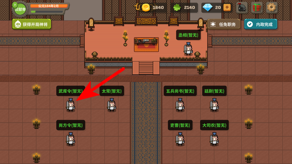 2、在大殿中点击武库令对应的职位区域,进入武库功能界面,这是管理武器装备的核心入口,后续的装备打造、资源管理等战力提升相关操作,都需通过该界面推进。