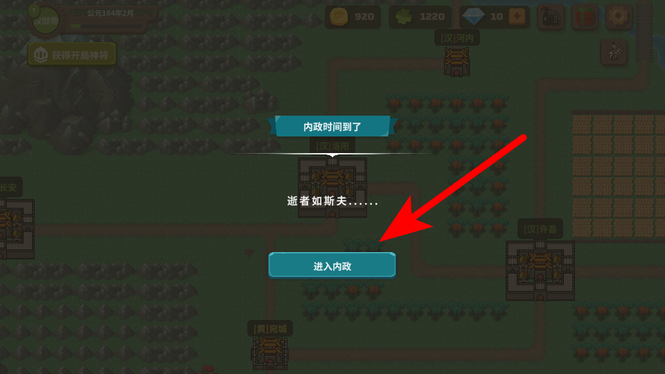1、当界面弹出内政时间到了的提示时,点击进入内政进入内政管理界面,这是开展城池内政建设的关键操作,通过该界面可解锁官职任命、资源调配等核心内政玩法。