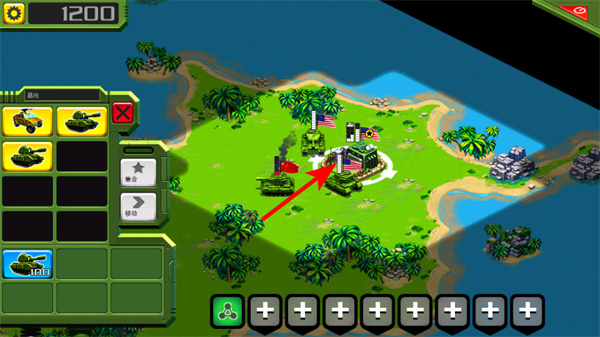 设有详细新手引导,点击基地即可选择坦克、大炮、火箭炮等装备进行建造,建成后点击单位可移动部署至作战区域,快速适应游戏节奏。