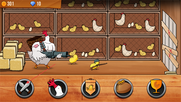 1、此界面是鸡笼准备场景,操控持枪鸡进行闯关,点击左下角的刀具样式按钮可以开启关卡挑战。