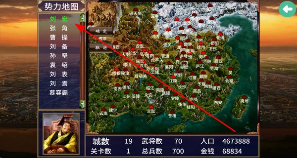 1、开局在势力地图中选择刘宏等势力,开启三国争霸之旅,玩家游玩势力选择体验。