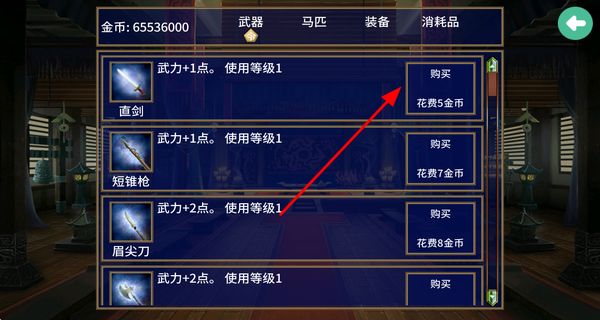 3、在商城购买直剑等装备,提升武将战力,增强部队战斗能力,丰富养成玩法。