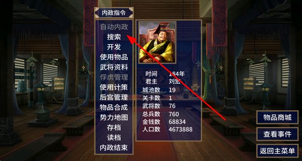 2、执行内政搜索指令,获取资源和武将,提升势力发展,助力三国争霸。