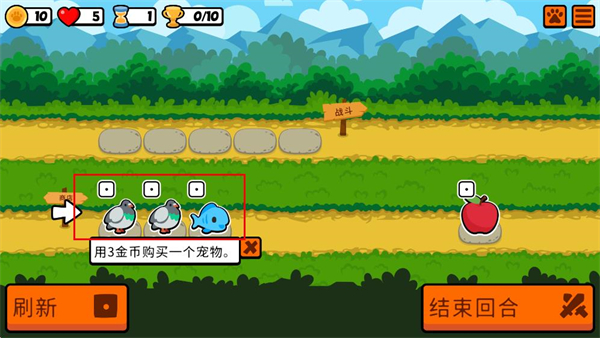 4、进入关卡后,用金币购买宠物,完成操作后点击“结束回合”推进流程。