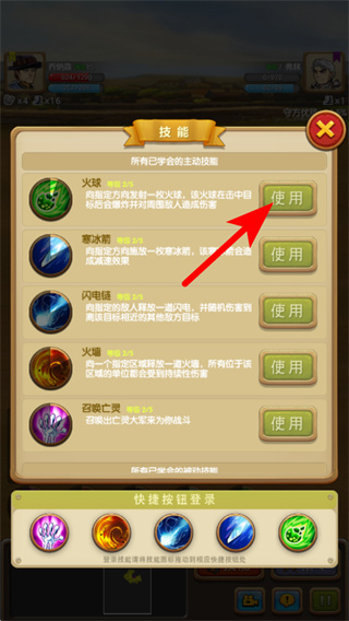 3、打开技能界面后,点击技能右侧的使用按钮如火球技能,可向指定方向释放该主动技能,对敌方造成伤害。