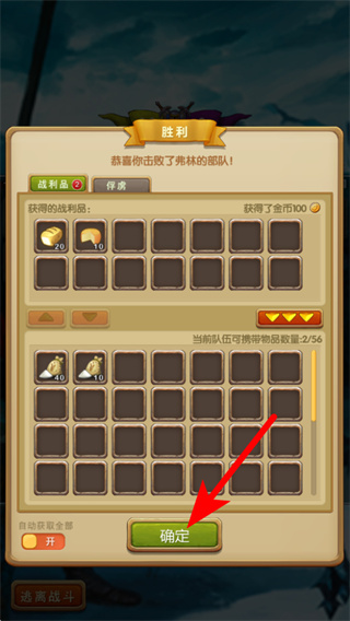 4、战斗胜利后,在战利品界面点击确定按钮,即可领取获得的物资,完成本次战斗的结算流程。