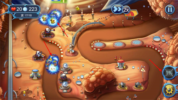 2、敌人波次来袭时,利用防御塔的攻击效果如爆炸、电攻,对敌人造成大量伤害。
