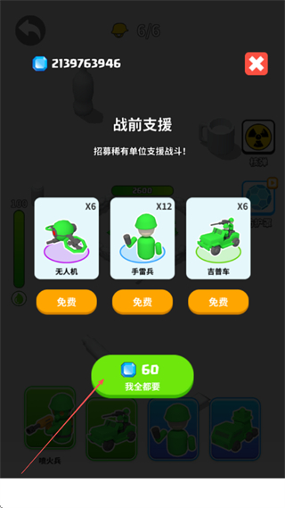 2、在战前支援界面,可选择免费招募单位,或花费60蓝钻选择我全都要,增强战力。