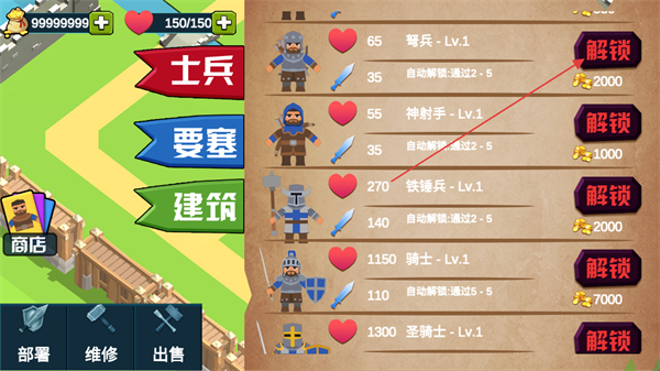 3、下滑商店界面,可以看到还有很多未解锁的士兵单位,点击其右侧的解锁按钮并消耗指定金币,即可解锁该单位用于后续部署。