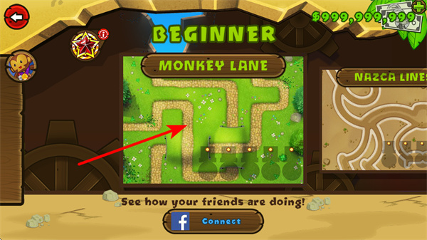 1、在游戏中,选择Monkey Lane地图开启关卡,地图选择是进入战斗的关键操作,可进入对应地图的气球防御战,开启挑战。