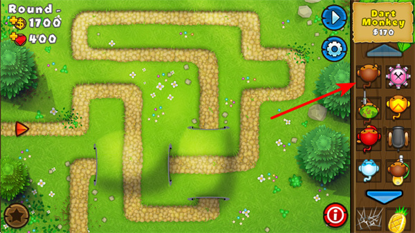 2、点击右侧Dart Monkey等防御塔进行建造,塔的建造是抵御气球的核心步骤,建造后可在地图上布置防御塔,对气球造成伤害。