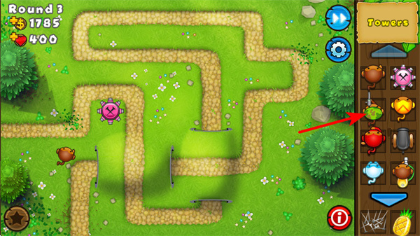 4、根据关卡进度选择新的防御塔类型,塔的选择是强化防御的重要操作,选择后可补充不同功能的防御塔,应对更强的气球波次。