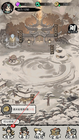 1、此为宗门主界面,可见灵气泉眼、宗门大殿等建筑,点击角色功能按钮,进入角色信息界面。