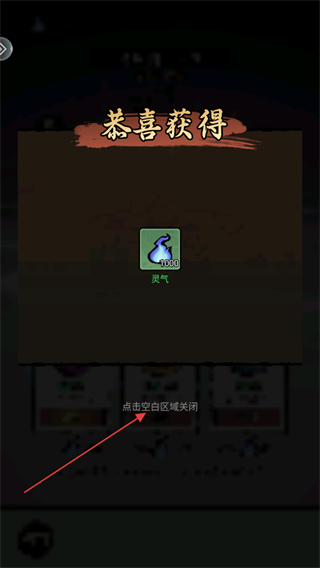 4、角色等级升到10级后,将会获得1000灵气奖励,按照提示点击空白区域关闭该界面,领取奖励用于后续修炼升级。