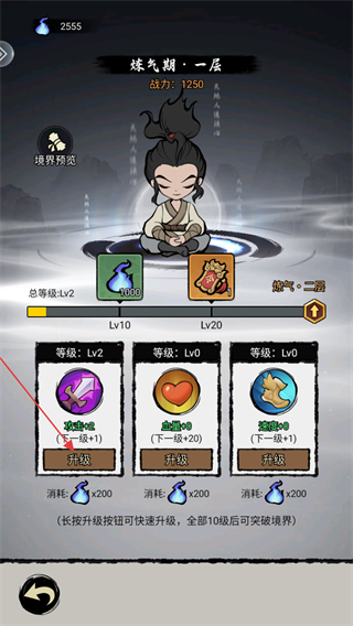 3、在境界属性界面,点击攻击等选项的升级按钮,消耗灵气提升升级,全部10级可突破至炼气二层。