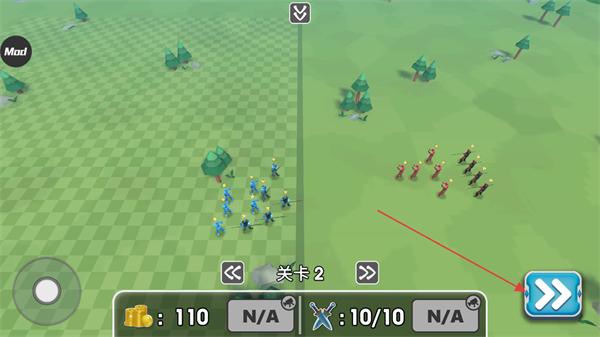 1、在关卡2部署己方蓝色士兵,确认兵力为10/10,点击箭头推进战斗。