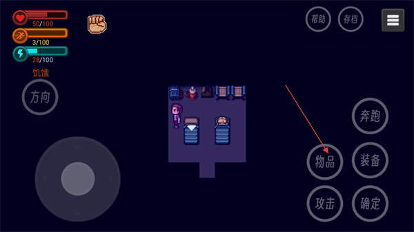1、当左上角的属性条出现饥饿提示时,我们需要进食了,点击右下角的物品按键打开背包。