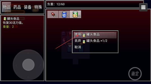 3、再次点击确定按键,会弹出选项框,点击使用罐头食品可以恢复活力值缓解饥饿状态。