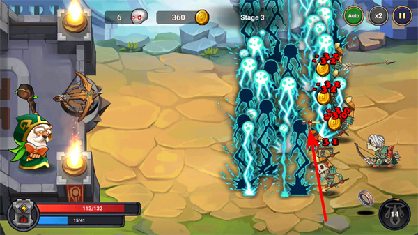 4、开启Auto自动战斗功能,可自动攻击敌人积累金币,确保自动战斗的攻击效率,建筑升级提供充足资源。