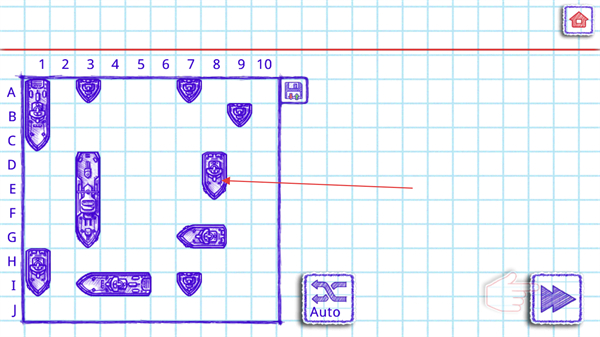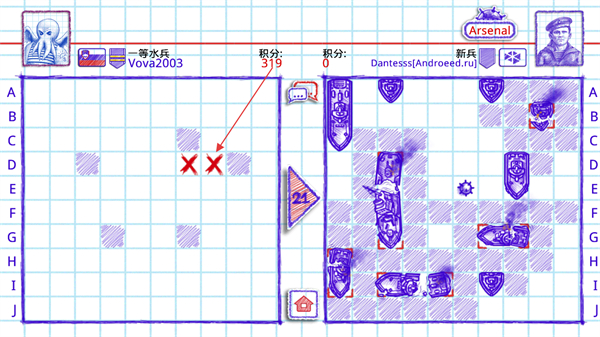 4、轮到我方回合时,选择点击敌方的棋盘如果出现红色叉叉则代表炸到敌方战舰可以继续攻击,否则轮换敌方攻击。