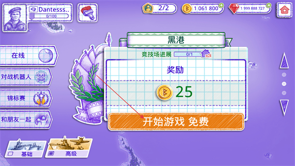 1、打开海战棋2游戏,进入游戏关卡选项,选择在线模式黑港竞技场进行挑战。