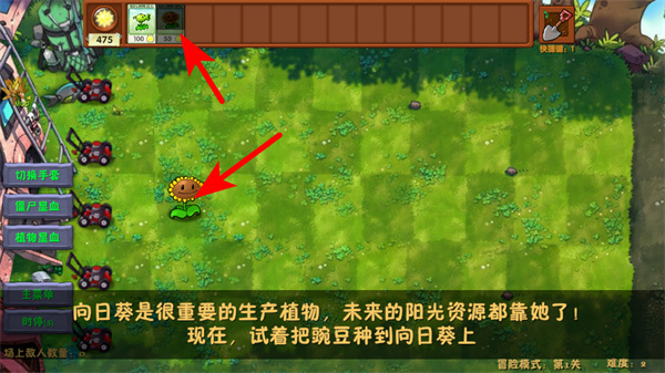 3、进入战斗场景后,先种植红色箭头指向的向日葵生产阳光资源,种植到下方的地盘,完成植物种植操作。