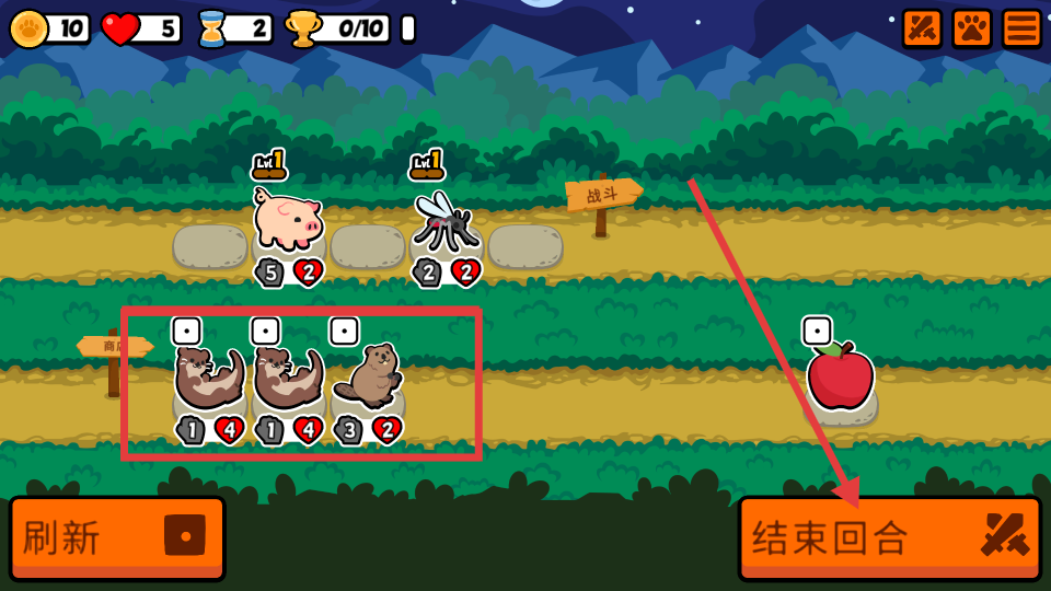 2、在战斗准备阶段,布置好己方如猪、水獭等角色后,点击结束回合,即可进入对战环节,需合理搭配角色战力。