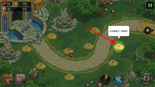2、遇到建塔提示时,点击指定区域的建塔点位,这是构建防御体系的核心步骤,初期优先选择性价比高的箭塔,快速形成基础防御。