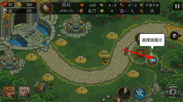 4、进入游戏战斗界面后,点击选择旗帜图示按钮,这是部署英雄的关键操作,准确点击可将英雄移动至指定区域,开启前线作战。