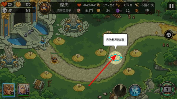 3、在英雄移动提示区域,点击把他移到这的目标位置,将英雄部署至战略点,部署时需结合敌人路径,优先选择靠近敌人密集的区域。
