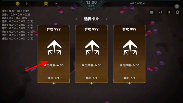 1、选卡阶段点击攻击增益卡片如攻击弹幕+6.00,可强化角色的输出能力,这是提升后续的战斗效率的关键的操作。