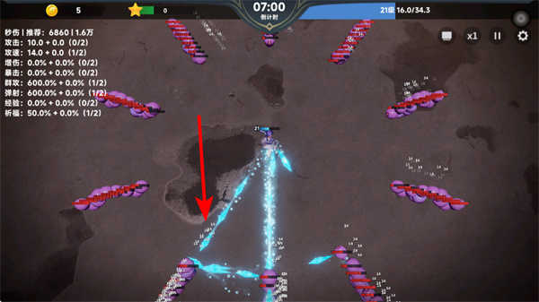 3、跟随红色箭头指引调整角色攻击方向,集中火力打击集群的敌方单位,这是高效清剿敌人的策略,能快速减少敌方数量。