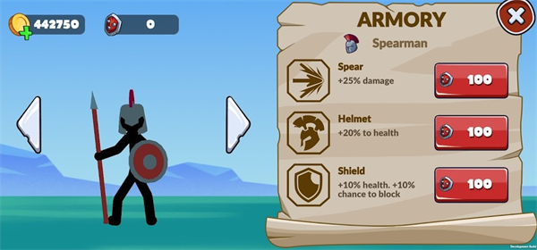 4、在军械库升级士兵装备如剑、头盔,提升士兵战力,应对更强敌人。