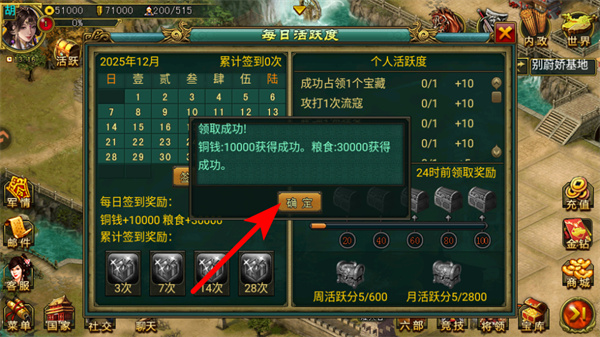 2、在每日活跃度界面,点击红色箭头指向的确定按钮,领取签到奖励铜钱、粮食,完成签到流程。