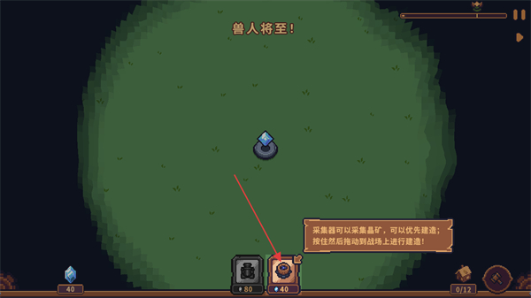 2、看到兽人将至的提示后,优先建造采集器来采集矿产,将其拖动到战场上完成建造以获取资源。