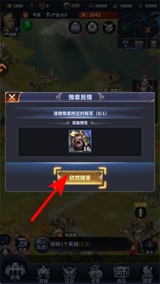 1、在豫章民情任务弹窗中,点击欣然接受按钮,接取清缴豫章附近叛军的任务,获取任务目标奖励。