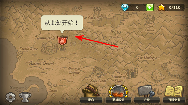 1、在地图界面点击带有红色旗帜的从此处开始区域,可进入防御关卡,这是游戏开始的关键操作,才能开启塔防战斗。
