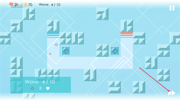 3、当当前波次的敌人清理完成后,点击界面右下角的箭头按钮,可加速游戏进程推进至下一波敌人,同时留意生命值与金币的变化。