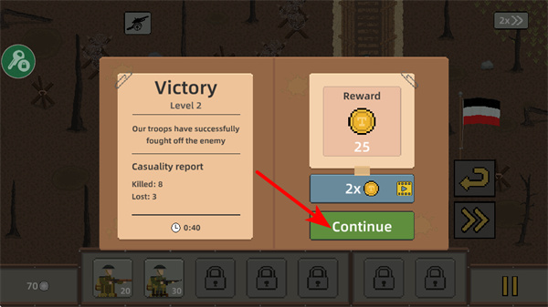 4、关卡胜利后点击Continue按钮继续游戏,继续操作可进入下一关挑战,不断提升军队实力以应对更难的战斗。