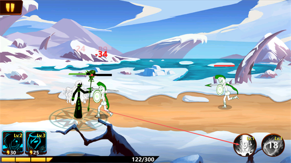 1、操控火柴人角色与敌方绿色持盾单位战斗,注意观察双方血量,把握攻击时机。
