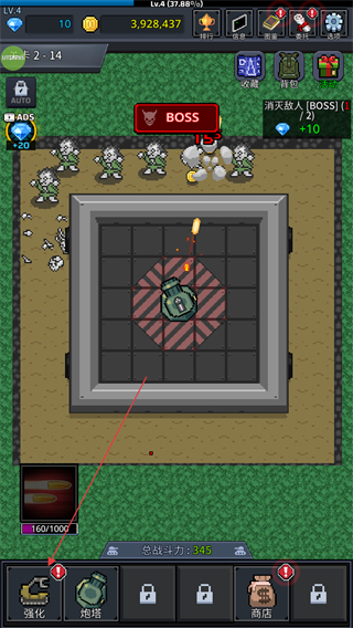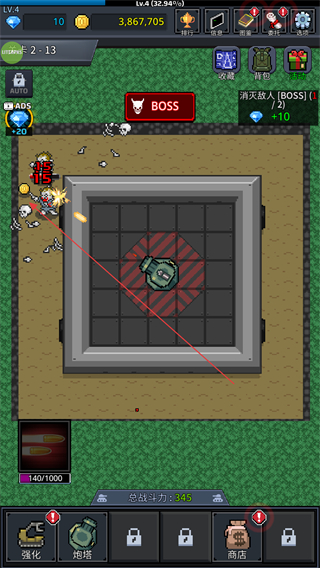 4、不断消灭敌人和BOSS,推进关卡进度,同时利用获得的资源强化炮塔,应对更强大的敌人。