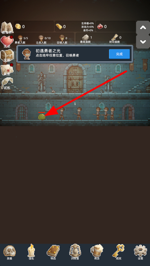 1、新手玩家首先在游戏中,可点击地牢任意位置,召唤勇者,召唤出的勇者能参与后续的战斗,为守护贵重物品等目标助力。
