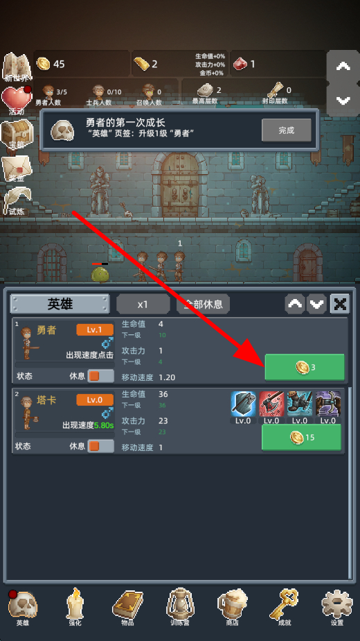 3、利用战斗获取的资源,对勇者升级,英雄界面,花费金币等资源提升勇者等级,升级后勇者的生命值、攻击力等属性会得到增强。