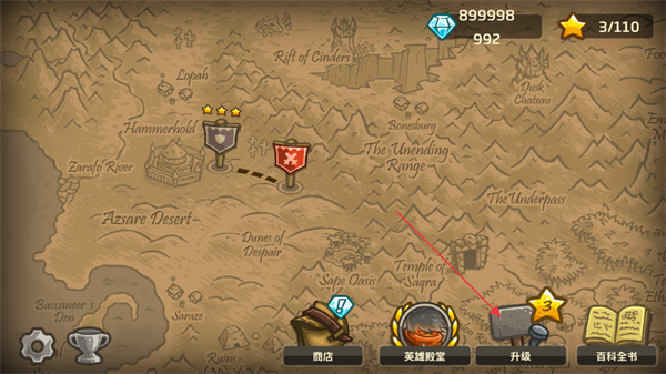 1、在游戏地图界面,可点击通过升级功能强化能力,也能借助商店、英雄殿堂筹备资源,推进关卡进度。
