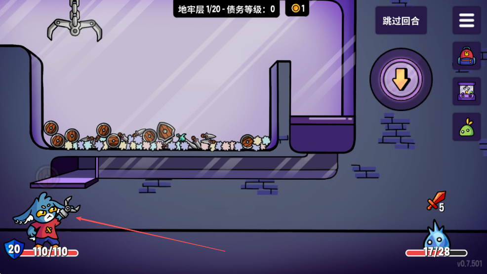 1、进入游戏,查看当前所在的地牢层数如箭头所指地牢层1/20和债务等级。