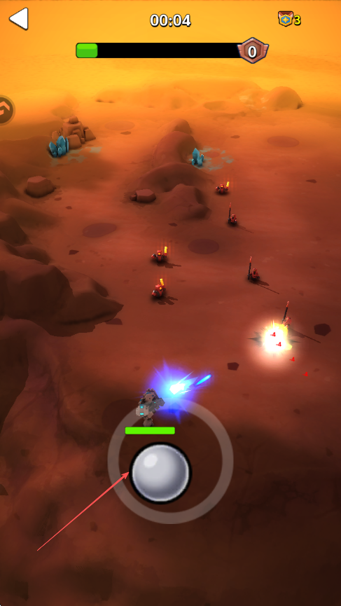 1、进入游戏,通过屏幕下方的虚拟操纵杆控制角色移动,在沙漠场景中探索。