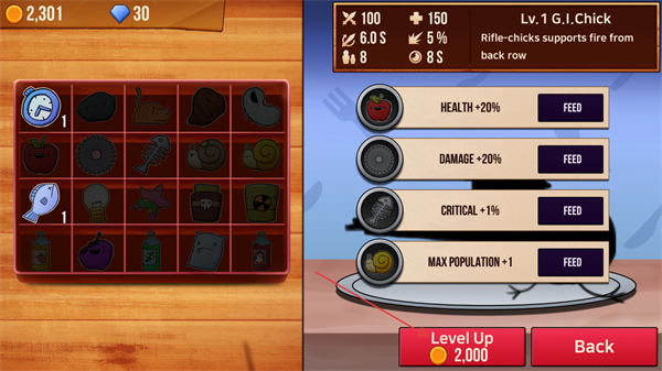 4、此界面可给G.I.Chick使用道具提升属性等,点击LevelUp按钮耗2000金币升级增强支援效果。