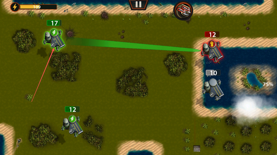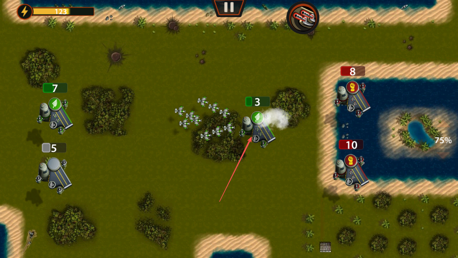 2、按箭头方向,从我方机场派遣飞机攻击敌方机场,减少敌方机场飞机数量12变为8。